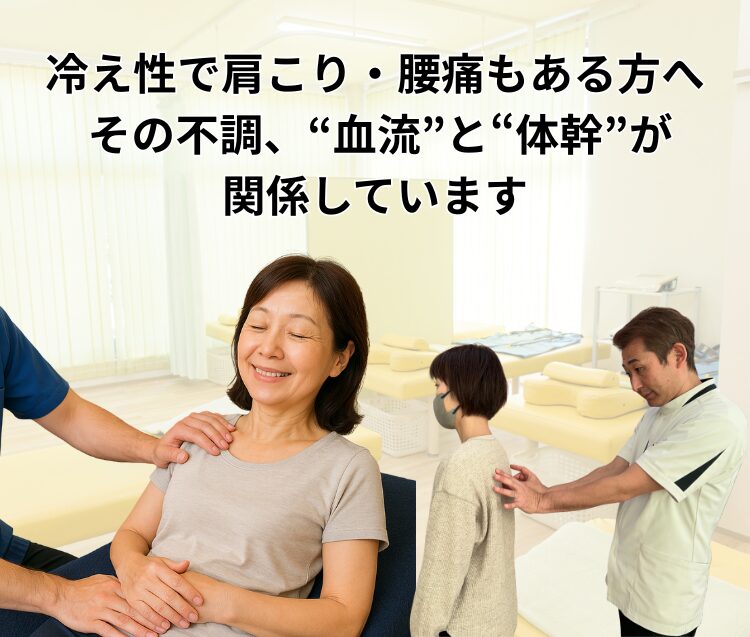 冷え症。特に末端型冷え症は身体の歪みが原因となることが多く、身体がねじれることで血流を悪くしている時があります。